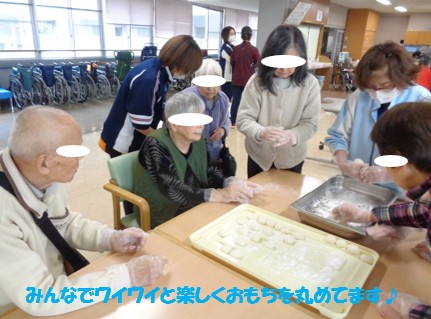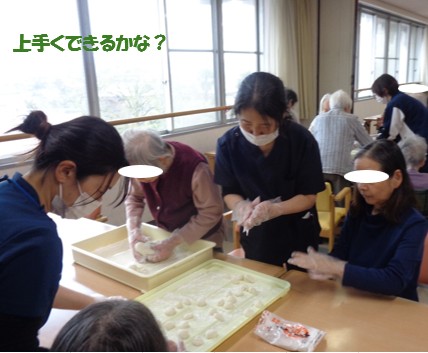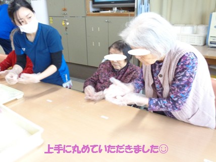美味しくなりますようにと職員と一緒に丸める姿はとても楽しそうでした